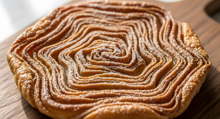 A close-up, overhead shot of a perfectly baked spiral pastry on a wooden cutting board. The laminated dough has many crispy, golden-brown layers, resembling a kouign amann or a modern croissant variation. It is lightly dusted with powdered sugar.