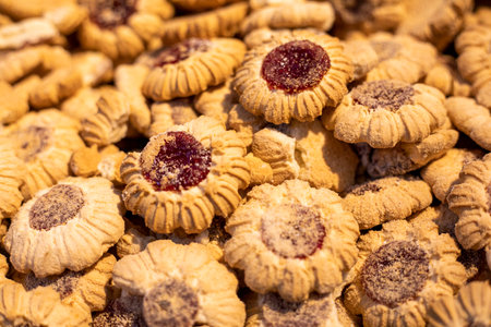 Cookies with a drop of raspberry jam, with a short pastry, sprinkled with ground cocoa beans.