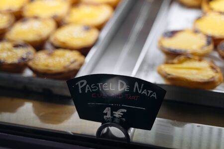 Pastels de nata for sale in a bakery, with a shallow depth of field