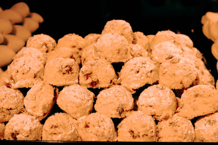 Fresh pastries with powdered sugar resting on display in a cozy bakery setting