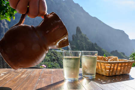 Man pouring white wine from clay jug into glass on terrace with view on green landscapes of small mountain village Masca on Tenerife, Spain in sunny day