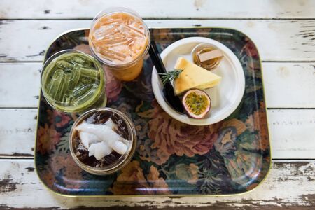 Americano ice coffee with coconut, Japanese matcha green tea, Red thai tea, and cheesecake with passion fruit on white wooden table by top view in cafe. Unhealthy eating of sweet desert.