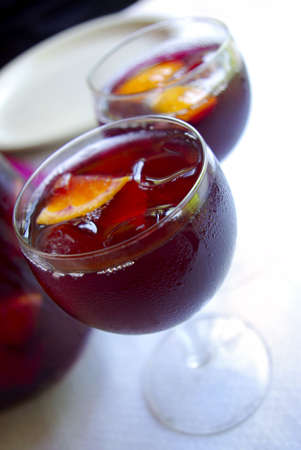 Refreshing cold sangria or punch with fruits in glasses in street cafe during hot day