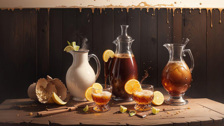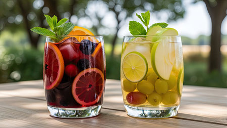 Two glasses filled with refreshing drinks, featuring ice and citrus slices, placed on a wooden table, creating a vibrant and inviting summer atmosphere
