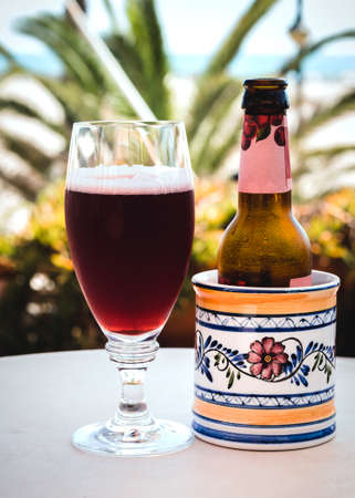 A cherry beer in glass and bottle with the beach and palm tree on the background