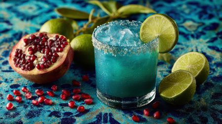 A stunning blue cocktail featuring pomegranate seeds and lime slices sits on a colorful textile background. Perfect for summer gatherings or special occasions.