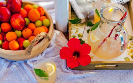 Glass of red lemonade drink with lemon and fruit and straw on the table. The concept of a bright summer Sunny holiday in the resort.