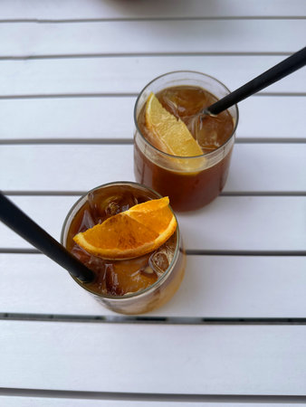 top view of glass of cold black orange coffee on wooden table in cafe in summer