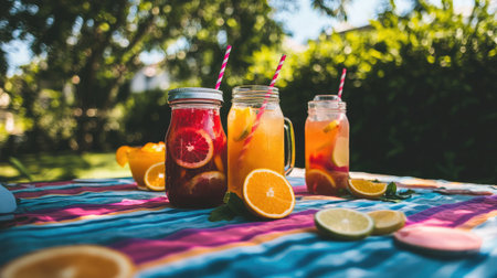 Fruit punch and fizzy drinks lined up on a colorful table outdoors, summer decorations scattered around