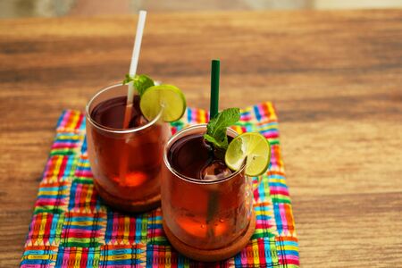 Twin ice tea in glasses with lemon slides and mint leaves on top