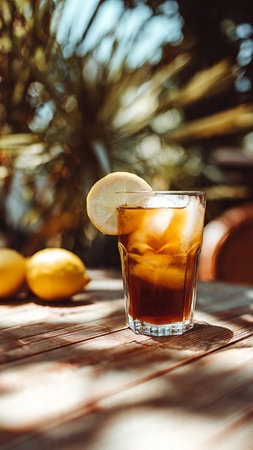 A close-up view presents a cold beverage in a glass, with ice cubes and citrus fruit. The drink's dark color contrasts with the translucent lemon slice. The composition is bright with good lighting, suggesting a hot day. Ideal for culinary themes, drinks promotions, or lifestyle content.