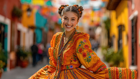 Female in bright traditional attire smiles in a lively street adorned with colorful decorations, showcasing cultural pride and joyful atmosphere
