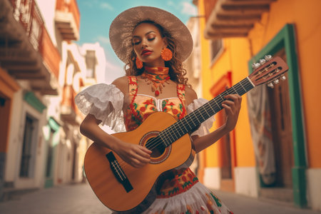 A beautiful Mexican woman in a hat plays the guitar on the street celebrating Cinco de Mayo