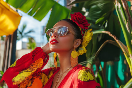 A woman poses confidently outdoors, surrounded by bright, flowing fabrics in red, yellow, and orange hues. Her stylish sunglasses and earrings add flair to the cheerful atmosphere.