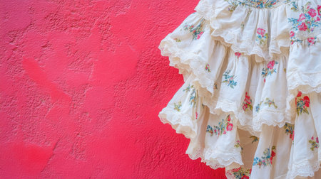 This stunning image showcases an elegant white ruffled dress adorned with delicate floral patterns, set against a vibrant pink background, perfect for fashion enthusiasts.