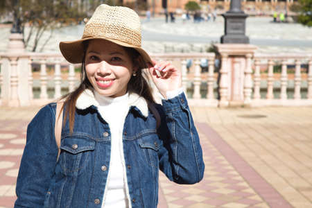 Young and beautiful asian tourist happy holding her hat on a sunny day during her vacation trip.