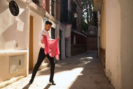 Young Spanish man in white shirt and black pants and dance shoes, dancing flamenco with a red handkerchief with white polka dots in a very narrow street. Concept art, dance, culture, tradition.