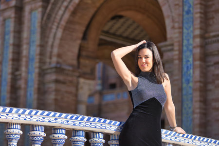 Young, beautiful, brunette woman in a fancy black dress, posing looking at the camera, leaning on a tiled railing on a bridge in the square of Spain in Seville. Concept beauty, femininity, tourism.