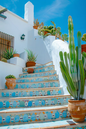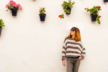 A young tourist in the flowerpots in the white houses of the town of Nerja, Andalusia. Spain. Costa del sol in the mediterranean sea