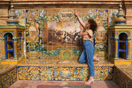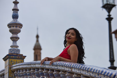 Young and beautiful brunette and latin woman, dressed in short red dress and red shoes visits the famous square in Seville, Spain. Woman leaning on the railing of a tiled bridge and is happy.
