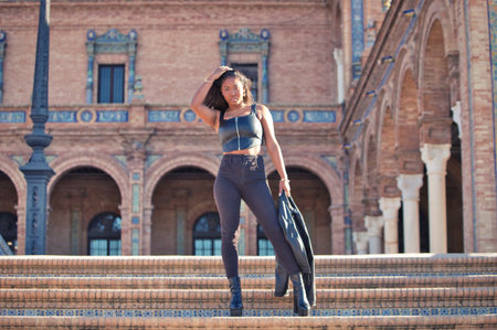 young and beautiful black latin woman visits the most important square in the city of seville. The woman is walking down the steps of the famous square where international fashion events are held.