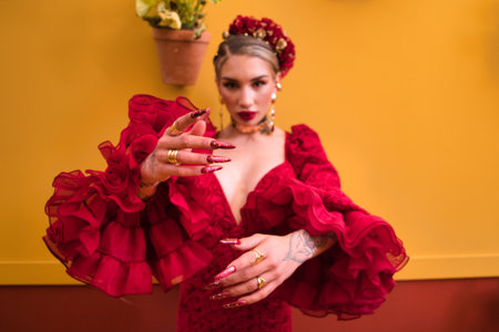A beautiful woman dancing flamenco in a red ruffled dress with makeup and false nails against an orange background and pots of geraniums in Seville, Spain. Flamenco, cultural heritage of humanity