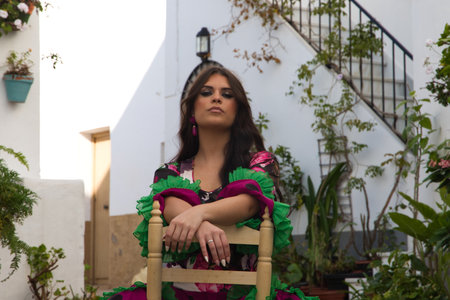 Young and beautiful woman dancing flamenco sitting on an old wooden chair in a typical street of Andalusia. She is dressed in a tailed gown with ruffles and flowers. The woman is a flamenco dancer