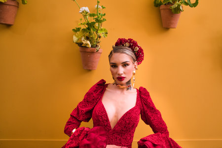 A beautiful woman dancing flamenco in a red ruffled dress with makeup and false nails against an orange background and pots of geraniums in Seville, Spain.