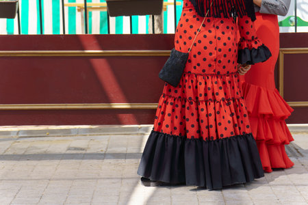 Two women wearing traditional red and black flamenco dresses are standing together, showcasing the vibrant culture of the Feria de Abril in Seville, Spain