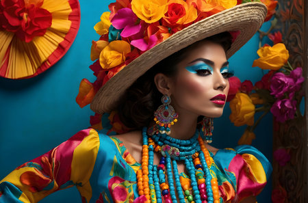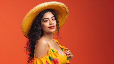 Vibrant Mexican Woman in Traditional Carnival Outfit on Solid Color Studio Background. Celebrating Cinco de Mayo. Generative AI