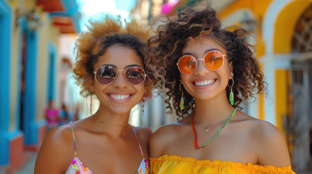 Portrait of two bright Smiling Cuban girls on the streets of Havana.