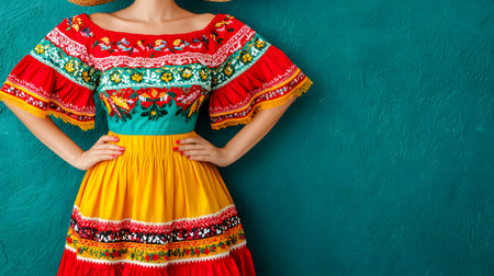 Vibrant Mexican Woman in Traditional Carnival Outfit on Solid Color Studio Background, Celebrating Cinco de Mayo. 16:9 Aspect Ratio. Copy Space. Generative AI