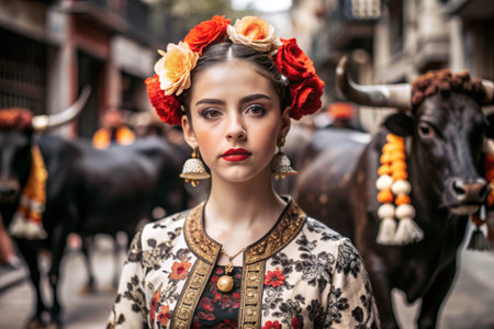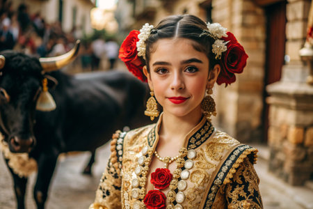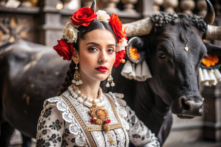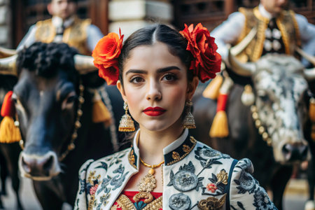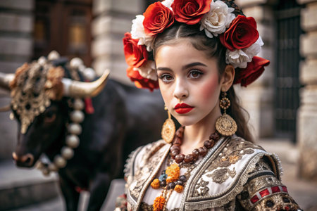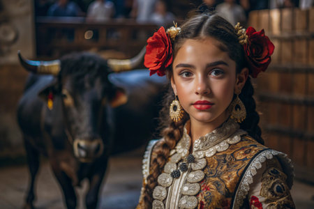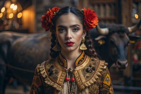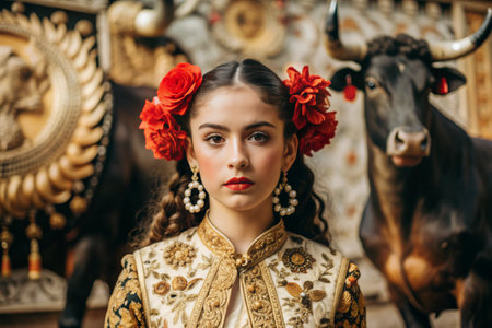 A Spanish girl in a traditional Spanish national costume. Against the background of a bull. Bullfighting. The portrait symbolizes the traditions and culture of the people of Spain.