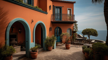Home architecture design in Mediterranean Style with Courtyard constructed by Stucco and Tile material. Andalusian style. Generative AI AIG25 .