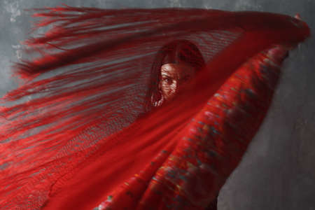 Young adult spanish woman dancing flamenco on gray vintage studio background