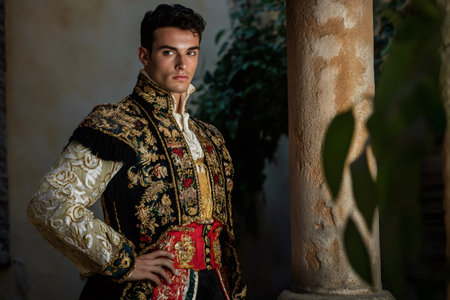 Young bullfighter posing elegantly in a traditional costume adorned with intricate embroidery, standing confidently near a grand column