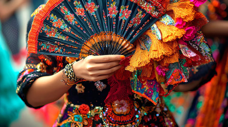 Vibrant Brazilian Carnival Performer with Decorated Fan and Colorful Costume. Concept of Cultural Celebration, Festive Atmosphere, Traditional Fashion, and Rich Heritage.