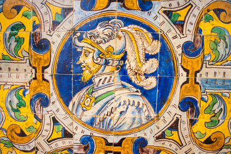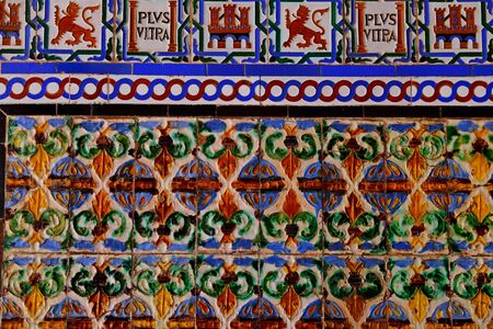 Seville, Spain. Beautiful azulejo (a form of Portuguese and Spanish painted tin-glazed ceramic tilework) in the Puerta de Aragon in Plaza de Espana