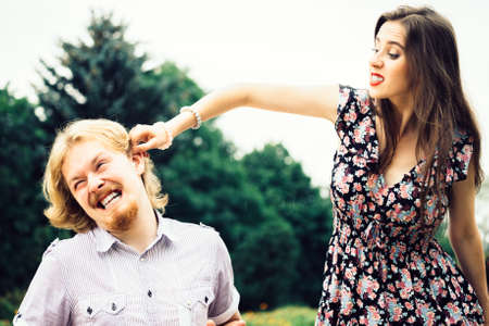 Violence against man. Aggressive woman yelling shouting on scared afraid man. Negative relations in partnership. Expressive young lady beating her partner.