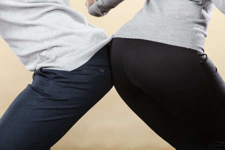Male jeans pants and woman in leggings. Their butts touching each other.