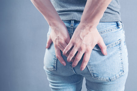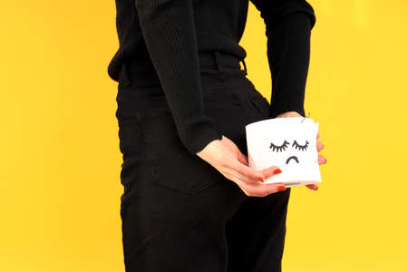 Woman holds toilet paper near her ass. Hemorrhoids concept