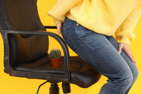 Woman with pain near chair with cactus on yellow background. Hemorrhoid concept