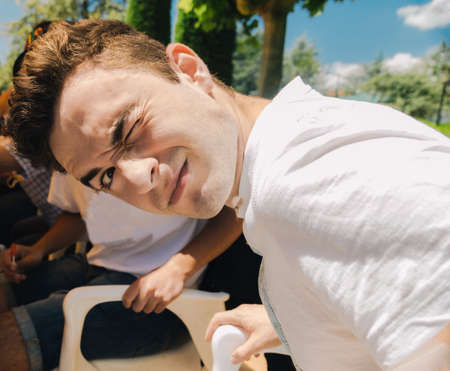 portrait young caucasian boy crouching down closing one eye with a winking and cheerful gesture on a sunny day with selective focus