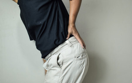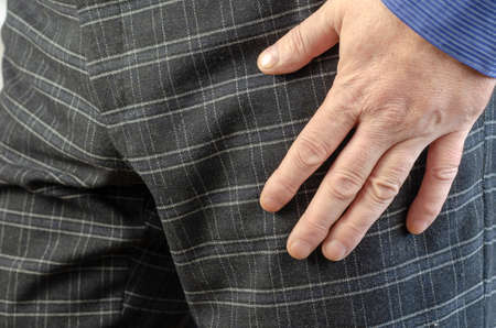 Man has Diarrhea Holding his Butt. Guy to hold with a hand a sore ass. the hand scratching a causal place.