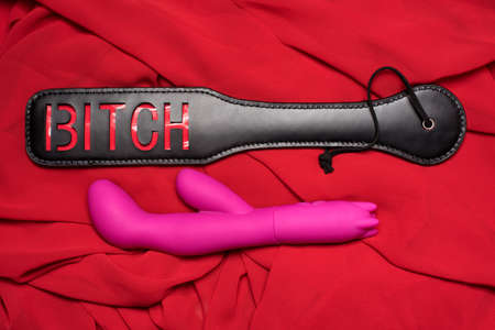 Women's things for a romantic evening - lacy black underwear, black whip, eye patch with fringe on a red background. Valentine's Day. love and passion