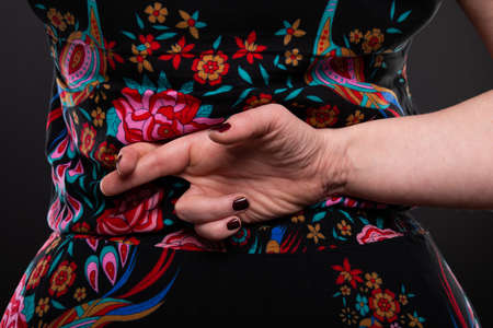 Crossed fingers. Liar sign. Fake promise. Unrecognizable dishonest woman hiding hands behind back isolated on red free space background.