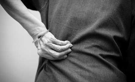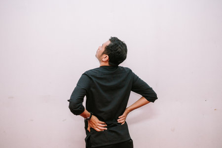 An upset man experiencing back pain, touching his lower back while looking up. Concept for health issues