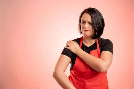 Woman employed at supermarket with red apron and black t-shirt, has shoulder pain isolated on red background