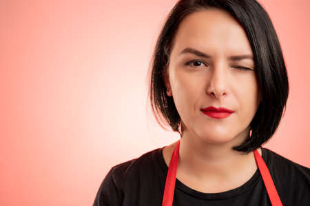 Woman employed at supermarket with red apron and black t-shirt, winking one eye isolated on red background
