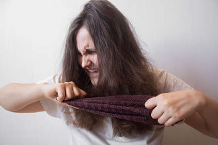 Furious female university student disheveling her blonde hair over blue background. Copy space studio shot. High quality photo